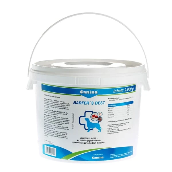 Mit Canina Pharma Barfer’s Best Pulver fütterst du deinen Hund artgerecht und sehr naturnah. Wichtige Vitamine, Enzyme und Mineralstoffe bleiben bei der Rohfütterung erhalten, die bei erhitztem, industriell verarbeiteten Hundefutter teilweise verloren gehen. BARF Hundefutter eignet sich als Alleinfutter, wenn die Ration genau berechnet wird. Eine Tagesration beim Barfen sollte ca. 3% des Körpergewichtes deines Hundes ausmachen.