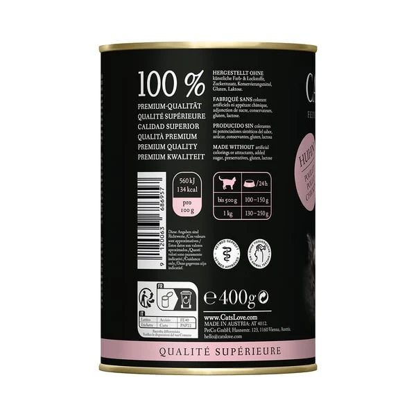Huhn 92 % (Hühnerflfleisch 43 %, Hühnerherzen 40 %, Hühnerleber 9 %),