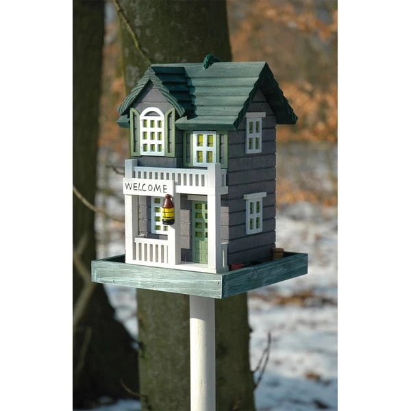 Das herzlich anmutende Vogelfutterhaus in eher gedeckten Farben ermöglicht die Futteraufnahme der Wildvögel problemlos. Es wurde aus Monterey-Kiefer angefertigt und lasiert. Deshalb ist es sehr robust und wetterbeständig. Einfach in den Boden stecken oder mit der vorhandenen Kordel aufhängen und das Futtersilo über das klappbare Dach befüllen.