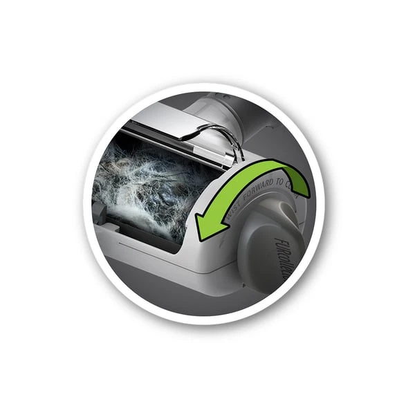 Rollen Sie mit dem Tierhaarsammler zur Aufnahme der losen Haare mehrmals über die betroffenen Stellen und Flächen. Drehen Sie während der Anwendung von Zeit zu Zeit den FURcollector-Knopf, um die losen Haare im Auffangbehälter aufzunehmen. Ist der Auffangbehälter voll bzw. nimmt die Rolle keine Haare mehr auf, öffnen Sie den Behälter per Knopfdruck. Entleeren Sie den Auffangbehälter, schließen Sie den Haarsammler wieder und schon können Sie weitermachen – bis alle Flächen sauber sind.