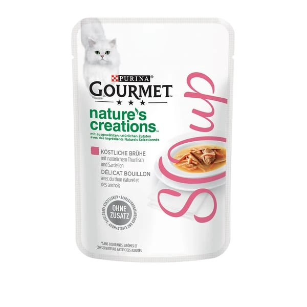 GOURMET Crystal Soup bietet eine Vielzahl köstlicher Brühen für ein einzigartiges Genusserlebnis, das Ihre Katze lieben wird. Voller naturbelassener Zutaten, wie echte erkennbare Fisch-Stückchen, ist GOURMET Crystal Soup ein köstliches Nassfutter, das Ihre Katze genüsslich schnurren lässt.