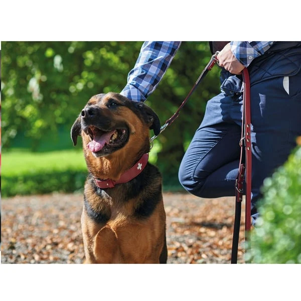 Um den Komfort für den Hundehalter zu erhöhen, ist die Leine mit weichem, schwarzem Rindnappaleder unterlegt, das in einer schönen farblichen Kombination zum Ökoleder steht. Die Leine ist gebuggt, weißt also keine offenen Kanten auf, und ist mit vernickelten Metallteilen ausgestattet, was beides die Langlebigkeit der Leine unterstützt. Um die Optik noch abzurunden, ist die Leine mit weißen Schweizer Kreuzen und farblich passenden Steppungen verziert.