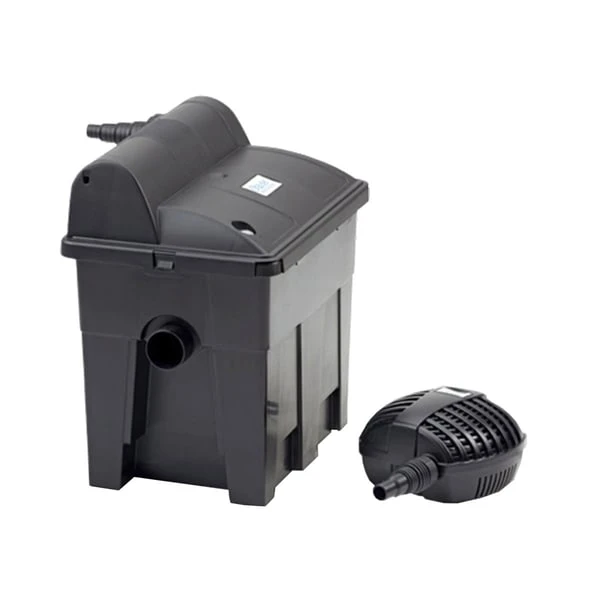 BioSmart Set 7000: Teichgröße von 7 m³ (bzw. bis zu 3,5 m³ bei Fischbesatz), 40 Watt Filterpumpe (Leistung 2500 l/h), integriertes 9 Watt UVC-Vorklärgerät, 3 m langer Schlauch