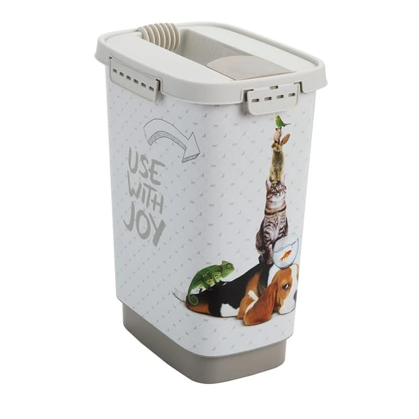 Tierfutterbehälter mit Verschluss-Clips. Die Box hat eine einfach zu öffnende Klappe (arretierbar) für ein leichtes Ausschütten von Trockenfutter. Der Behälter lässt sich einfach mit zwei Händen handhaben, dank eines bequemes Griffes im Deckel. Deckel mit Dichtung. Der Tierfutterbehälter wird aus lebensmittelechtem Material produziert und hat ein Volumen von 10 l bzw 25 l.