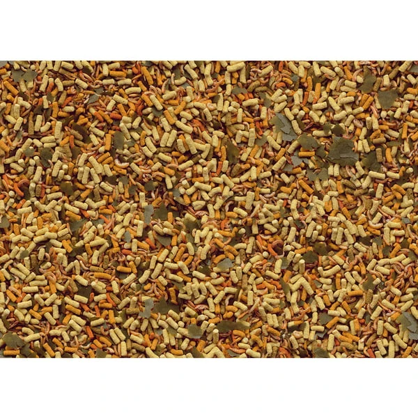 Getreide, Pflanzliche Eiweißextrakte, Pflanzliche Nebenerzeugnisse, Weich? und Krebstiere (Sonnengetrocknete Bachflohkrebse 13 %), Fisch und Fischnebenerzeugnisse, Algen (Spirulina 4 %), Hefen, Öle und Fette, Mineralstoffe, Gemüse.