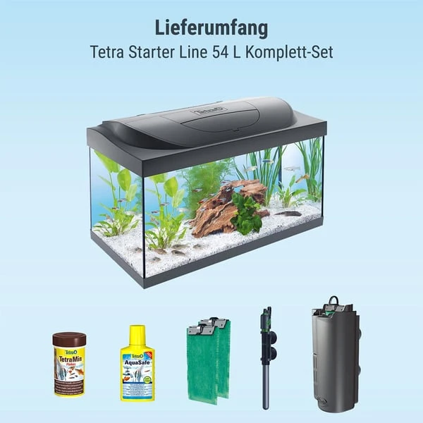 Die Tetra Starter Line Aquarien sind ideal für alle Aquaristik-Einsteiger geeignet. Die Aquarien sind nicht nur in vier verschiedenen Größen erhältlich (30, 54, 80 und 105 Liter), sondern auch mit hilfreichen Funktionen und wesentlichem technischen Zubehör ausgestattet. So ist das kleinere Modell besonders gut für Krustentiere und Pflanzen geeignet. Guppys, Platys und Co. halten Sie dagegen ideal im Aquarium der mittleren Größe. Die besonders stabilen Aquarienbecken sind mit vier Millimeter starken Scheiben aus einem speziellen Float-Glas ausgestattet und sorgen somit aus jedem Blickwinkel für eine unverzerrte Sicht auf Ihre Aquarienbewohner. Auch die Aquarienabdeckung ist besonders robust, damit zum Beispiel kletterfreudige Krebstiere nicht entwischen können. Eine praktische Futterklappe im Deckel sorgt dafür, dass du deine Fische ganz einfach füttern kannst, ohne die Abdeckung abnehmen zu müssen. Die in der Abdeckung integrierte zehn Watt starke LED-Leuchte mit Tag-/ Nachtlichtschaltung lässt dein Aquarium in einem hellen und natürlichen Licht erstrahlen und ist dabei besonders energiesparend und langlebig. Zusätzlich sorgt der im Set enthaltene Tetra EasyCrystal Filter für sauberes und kristallklares Wasser, da er Algen und Verunreinigungen zuverlässig beseitigt. Und das funktioniert so: Bei der biologischen Filterung sorgen Bio-Filterbälle und ein Filterschwamm für die Ansiedlung nützlicher Bakterien. Bei der mechanischen Filterung dagegen entfernt ein Filter-Vlies kleinste Schwebeteilchen aus dem Wasser. Und das Beste: Durch austauschbare Filterkartuschen bleibt dir eine aufwendige Reinigung des Filtergehäuses erspart. Die Kartuschen sind kinderleicht und ohne nasse Hände einsetzbar. Für eine optimale Wasserqualität solltest du die Kartuschen alle vier Wochen auswechseln. Eine Ersatz-Filterkartusche ist im Set enthalten. Die Komplettsets des 54, 80 und 105 Liter Aquariums enthalten zudem einen zuverlässigen Heizer, der die Wassertemperatur konstant bei 25°C hält. Detaillierte Angaben zum Fischbesatz ist der Verpackung des jeweiligen Aquariums zu entnehmen. Die einfache Installation und das umfassende technische Zubehör machen das Tetra Starter Line Aquarium zum idealen Aquarium für jeden Aquaristik-Einsteiger.