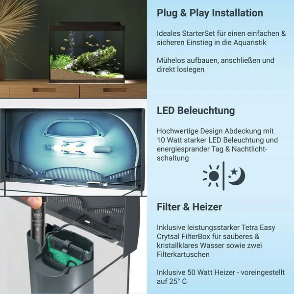Die einfache Bedienung und zuverlässige Technik machen dieses Aquarium deshalb zu einem idealen Starter-Set. Das stabile 54 Liter Aquarium ist mit einer 10 Watt starken LED-Leuchte mit Tag-/ Nachtlichtschaltung, einem mühelos zu reinigenden Filter, einem zuverlässigen Heizer sowie jeweils einem hochwertigen Futter- und Pflegemittel ausgestattet.
