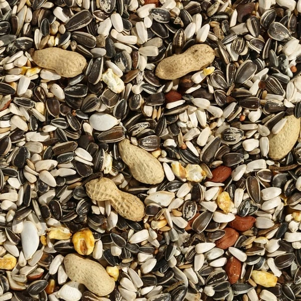 Gestreifte Sonnenblumenkerne (25 %), weiße Sonnenblumenkerne (20 %), Plata Mais (7 %), Weizen (6 %), gestutzter Hafer (5 %), Cardy (5 %), Buchweizen (5 %), enthülste Erdnüsse (5 %), ungeschälte Erdnüsse (4 %), Paddy Reis (4 %), Milokorn (3 %), Hanfsaat (3 %), Haferkerne (3 %), Puffmais (2 %), Zirbelnüsse (2 %), Kürbiskerne (1 %)